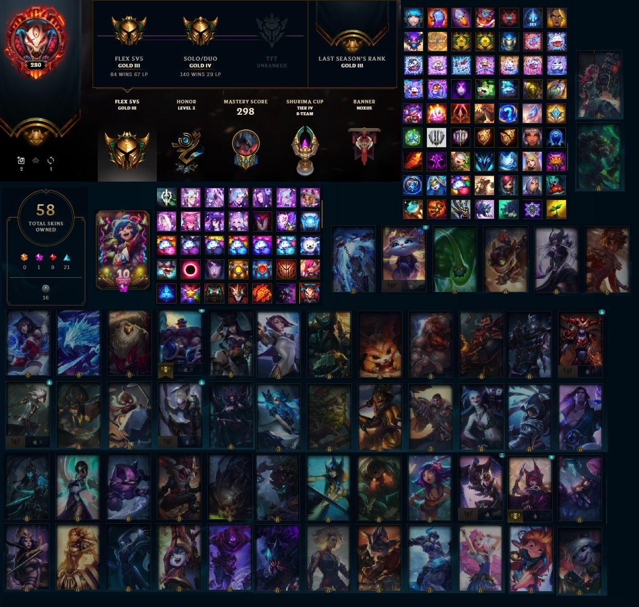 Level 280 | Unranked | 99 Champions | 58 Skins | Victorious Lucien