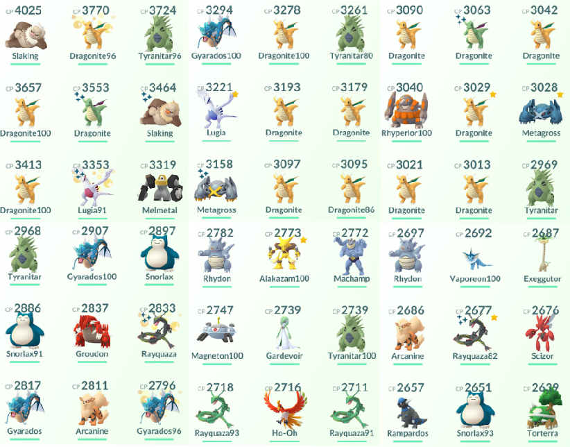 • Highest CP Pokemon: Slaking (4025, 3464), Dragonite (3770 3657, 3553, 3413), Tyranitar 3724, Lugia 3353, Melmetal 3319, Gyarados 3294